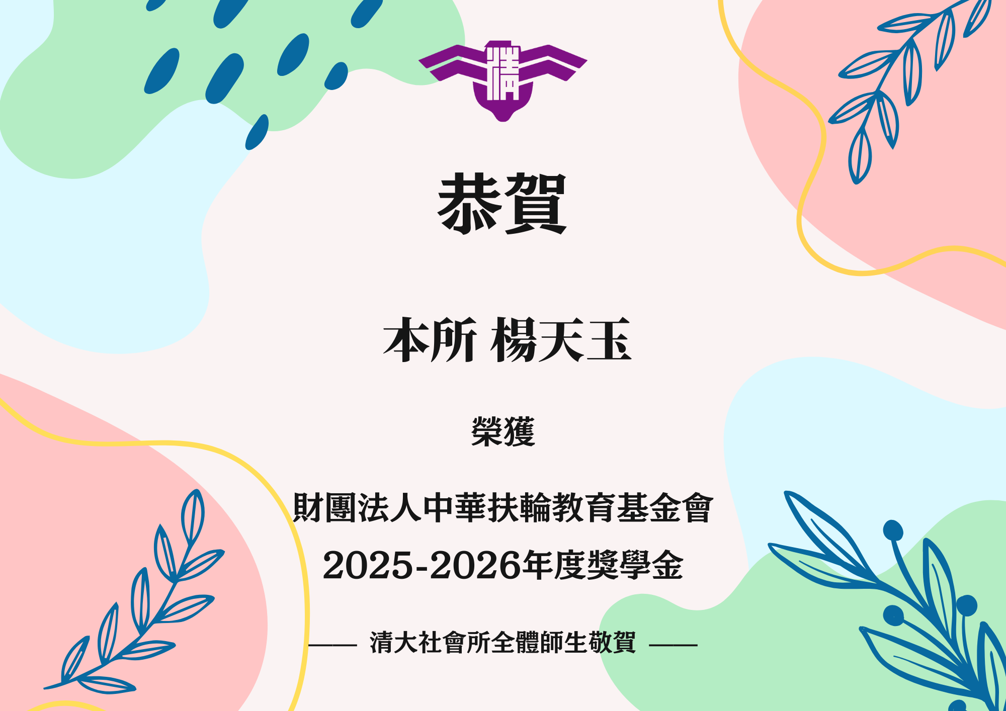 【賀】本所碩士生楊天玉 榮獲「財團法人中華扶輪教育基金會2025-2026年度獎學金」