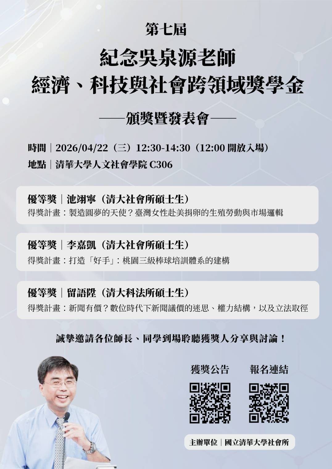 【獎學金頒獎暨發表會】第七屆「紀念吳泉源老師經濟、科技與社會跨領域獎學金」頒獎暨發表會