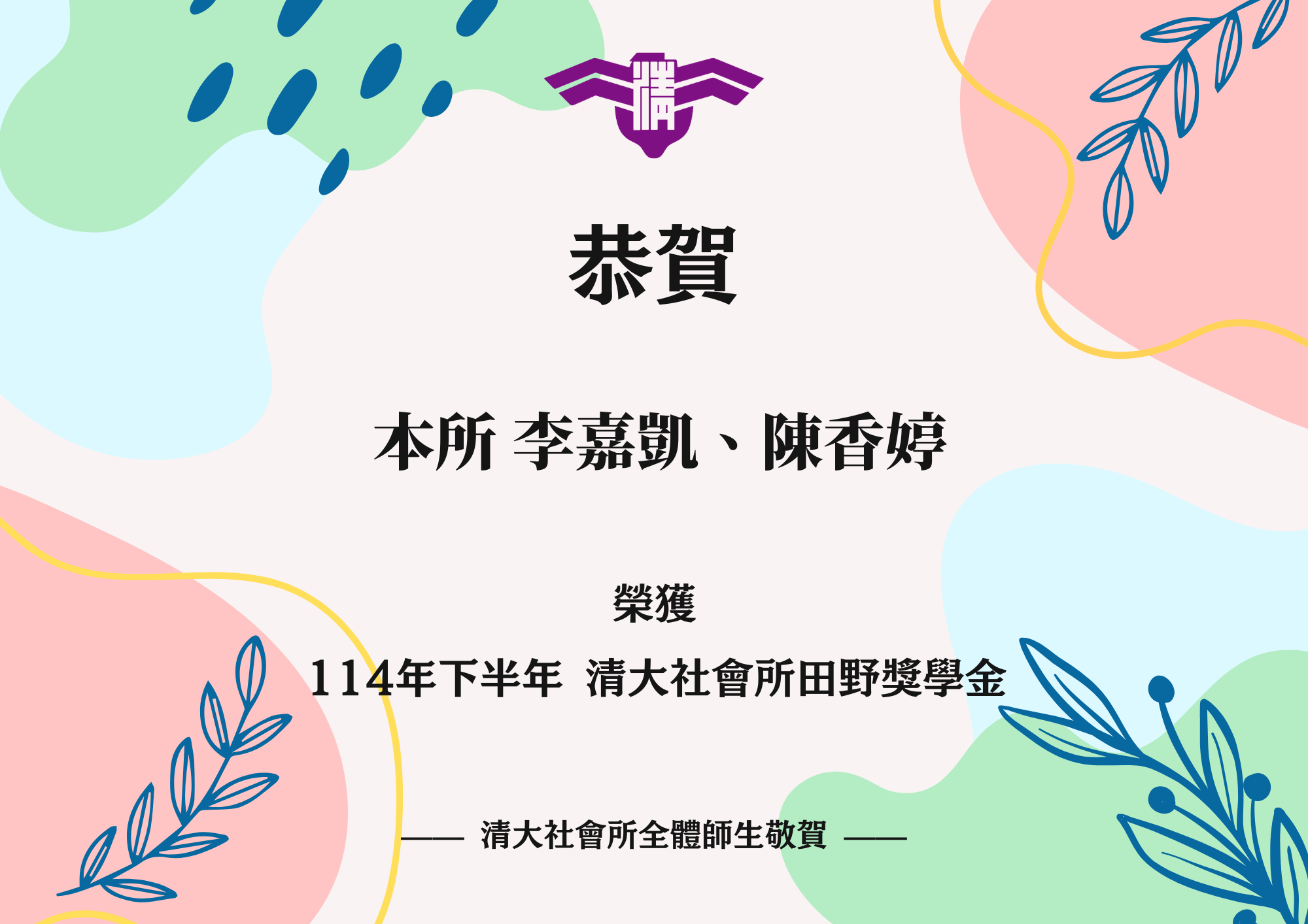 【獎學金】本所碩士班 李嘉凱、陳香婷同學 榮獲114年下半年度清大社會所田野獎學金